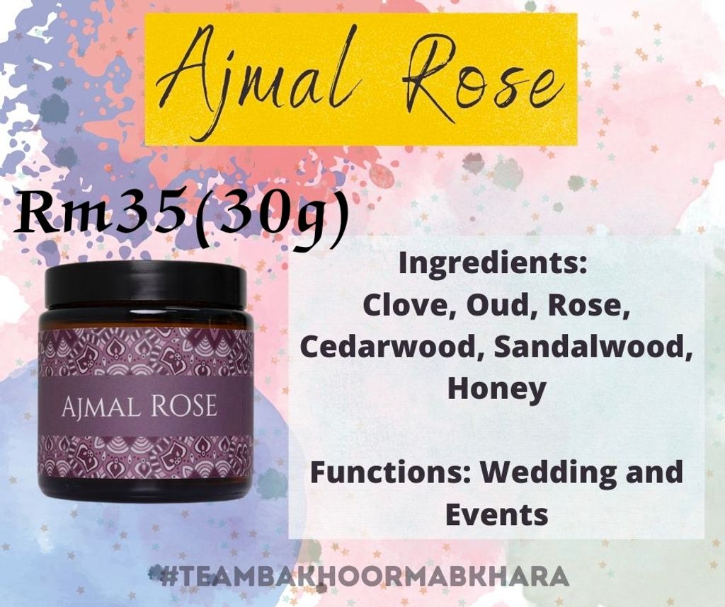 Bau bungaan rose semestinya lebih memikat seperti lambang kewanitaan. Bakhoor ini akan membuatkan kita perasan dengan bauan yang manis bunga ros bersama madu ke ‘range’ kesegaran seperti di ladang daun teh. Juga akan ada sedikit bau fruity (small amount) dan musky. Yang pasti, aroma dari Ajmal Rose pasti membuatkan kita jatuh hati dengan kelembutan dan kemanisannya. A very welcoming scent (menambat hati). Recommended untuk majlis keramaian.